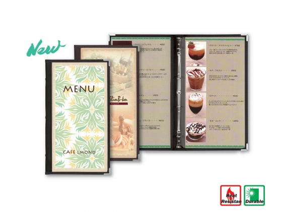 SLIM-B-ABW-21 is A4  6 pages slim size menu cover with Shimbi special ultra-slim 12.5mm binding ring clip.